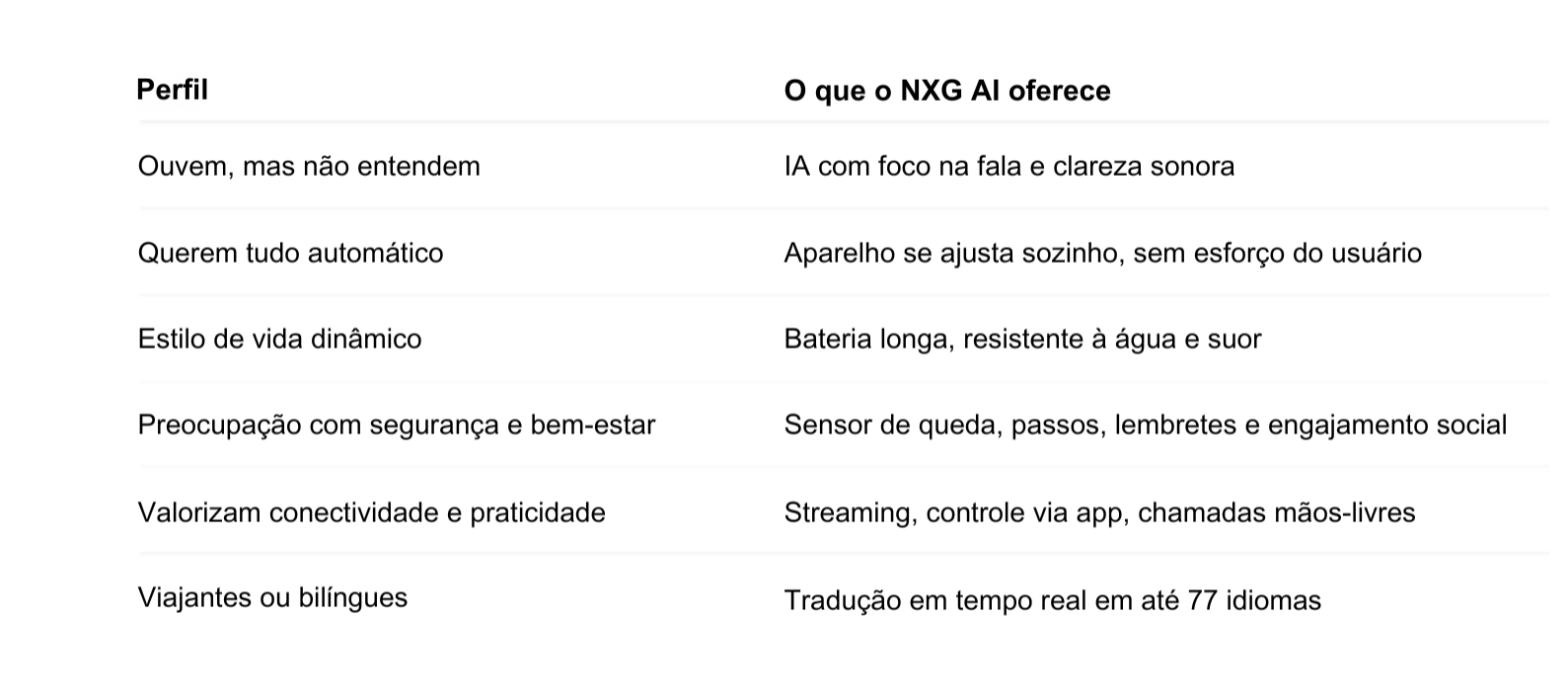 NXG AI combina inteligência artificial de ponta, com o novo Neuro Processor, mais de 80 milhões de ajustes auditivos por hora e rede neural capaz de processar som como o cérebro humano. O Edge Mode+ adapta automaticamente o áudio conforme o ambiente, enquanto o design ergonômico e recargas de até 51 horas garantem conforto e liberdade. Com o app My Starkey, o usuário controla volume, programas e funcionalidade de saúde — incluindo contagem de passos, alertas de queda e lembretes inteligentes — diretamente do celular.